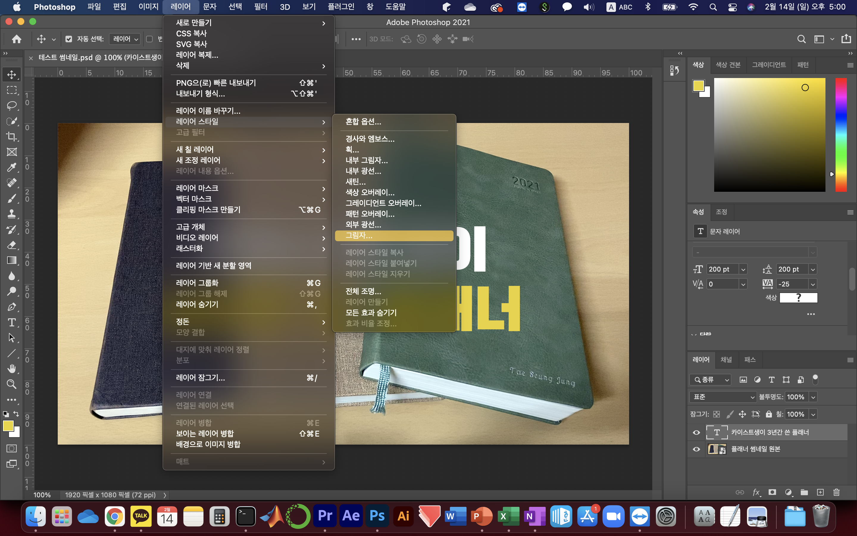 의외로 많은 사람들이 놓치는 부분인데, 텍스트에 그림자만 살짝 넣어줘도 썸네일에 심도가 더해져 뒤에 있는 이미지와 잘 어우러진다. 텍스트 레이어를 선택한 후 메뉴의 [레이어 > 레이어 스타일 > 그림자]로 설정할 수 있다. 영상 자막에도 이렇게 그림자를 넣어주면 뒤에 검은 배경이 없어도 가독성이 꽤 높아져서 유용하다.