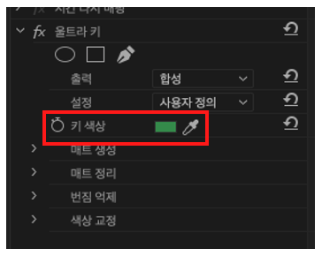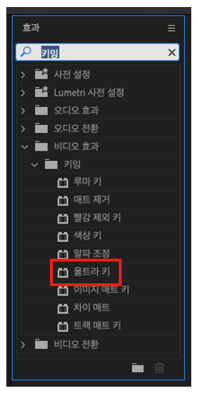 [효과 패널 > 키잉 > 울트라 키]를 통해 찾을 수 있으며, 이를 영상 클립에 끌어서 놓으면 된다. 그 후 효과 컨트롤 패널에서 스포이트로 지우고자 하는 배경을 선택하면 배경이 까맣게 변하는 걸 볼 수 있다. 이 화면을 PNG 파일로 저장하면 투명한 배경인 것을 확인할 수 있다.
